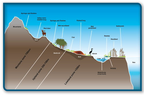 They range from coastal salt marshes and wet dune slacks, to fens, marshes and wet woodlands in river valleys and loch edges, to the springs and flushes, wet heath and blanket bogs on mountain slopes and plateaux. Wetland types are described in the Scottish wetland typology